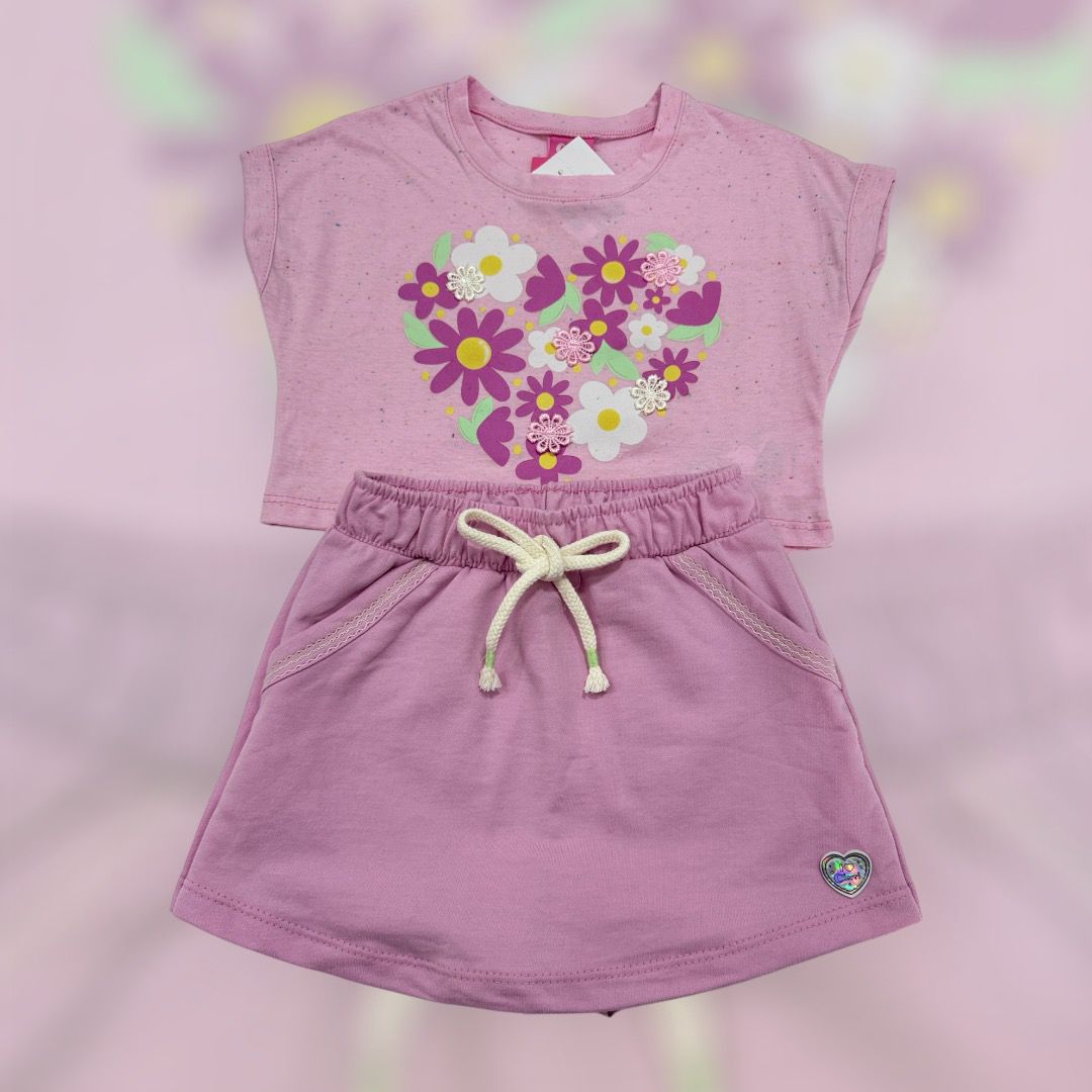Conjunto que traz estilo e conforto para as pequenas fashionistas! A blusa cropped, confeccionada em meia malha botonê, conta com uma estampa delicada e um lindo aplique de flores na parte frontal, perfeita para os dias mais quentes. O short-saia em moletinho apresenta um cós elástico com cadarço decorativo, garantindo um ajuste confortável e divertido. Os bolsos frontais com costura contrastante adicionam um toque especial, enquanto a etiqueta decorativa próxima à bainha finaliza o look com charme.