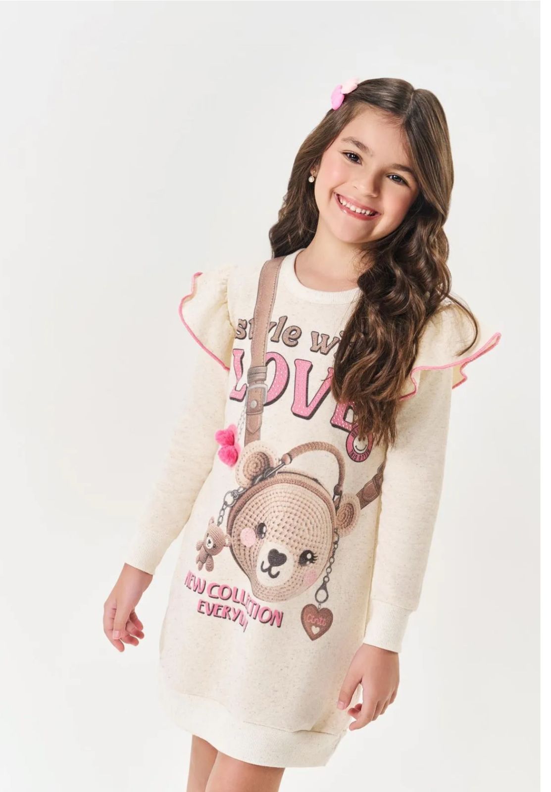 Vestido em moletom linho felpado, proporcionando conforto e um toque suave com seu tecido macio. O detalhe de frufru nos ombros adiciona um charme delicado e feminino, enquanto a estampa frontal com strass traz um toque de brilho sofisticado. O detalhe de pompons complementa a peça com um toque lúdico e divertido. A barra e os punhos em ribana garantem um ajuste perfeito e um acabamento elegante. Ideal para looks casuais e cheios de personalidade, esse vestido une conforto, estilo e detalhes encantadores para o dia a dia.